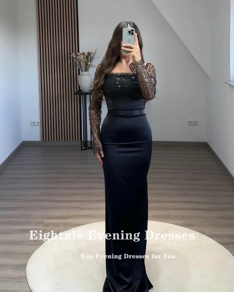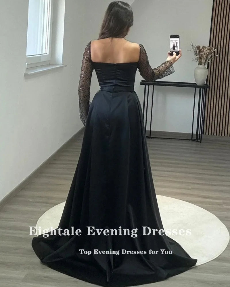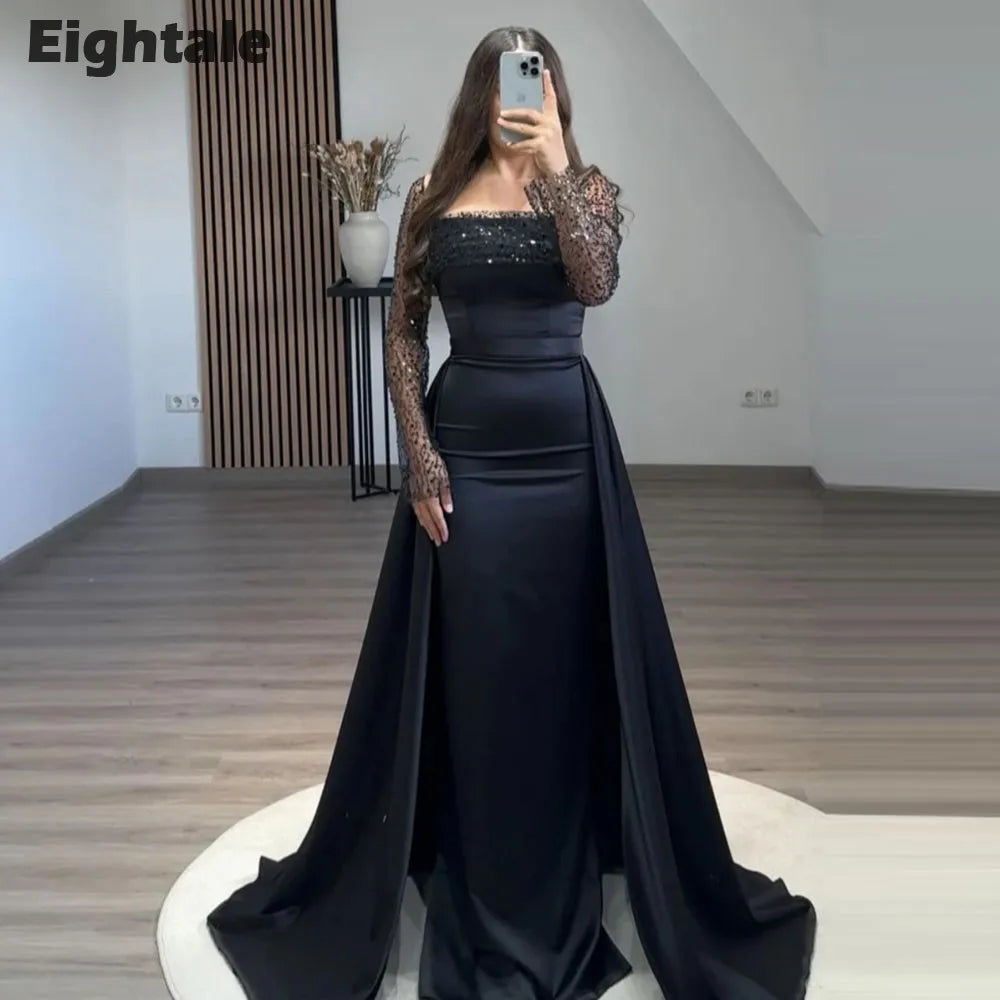 Eightale Black Evening Dresses with Detachable Skirt Sequin Long Sleeves Customized Prom Party Gown Wedding