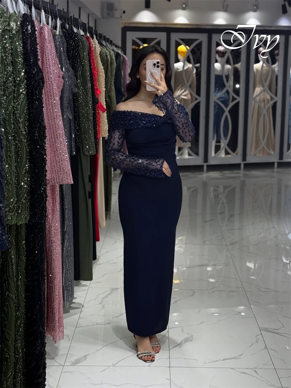 Customized Luxury Off the Shoulder Long Sleeves Evening Dress High Quality Jersey Prom Dresses Temperament Crystal Party Gowns