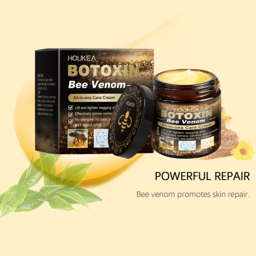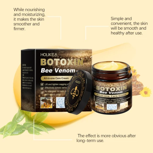 Our bee venom skin care cream contains bee venom and tea tree oil. It slows down the formation of fine lines. Tea tree oil purifies and soothes the skin and has anti-inflammatory and antibacterial effects. Its application method is simple: clean dry skin, apply appropriate amount of this product to the affected area, massage until absorbed. And the hyaluronic acid can lock in water for a long time and moisturize for a long time.