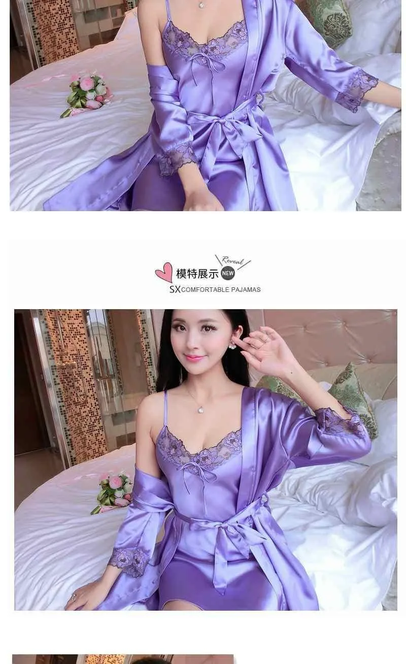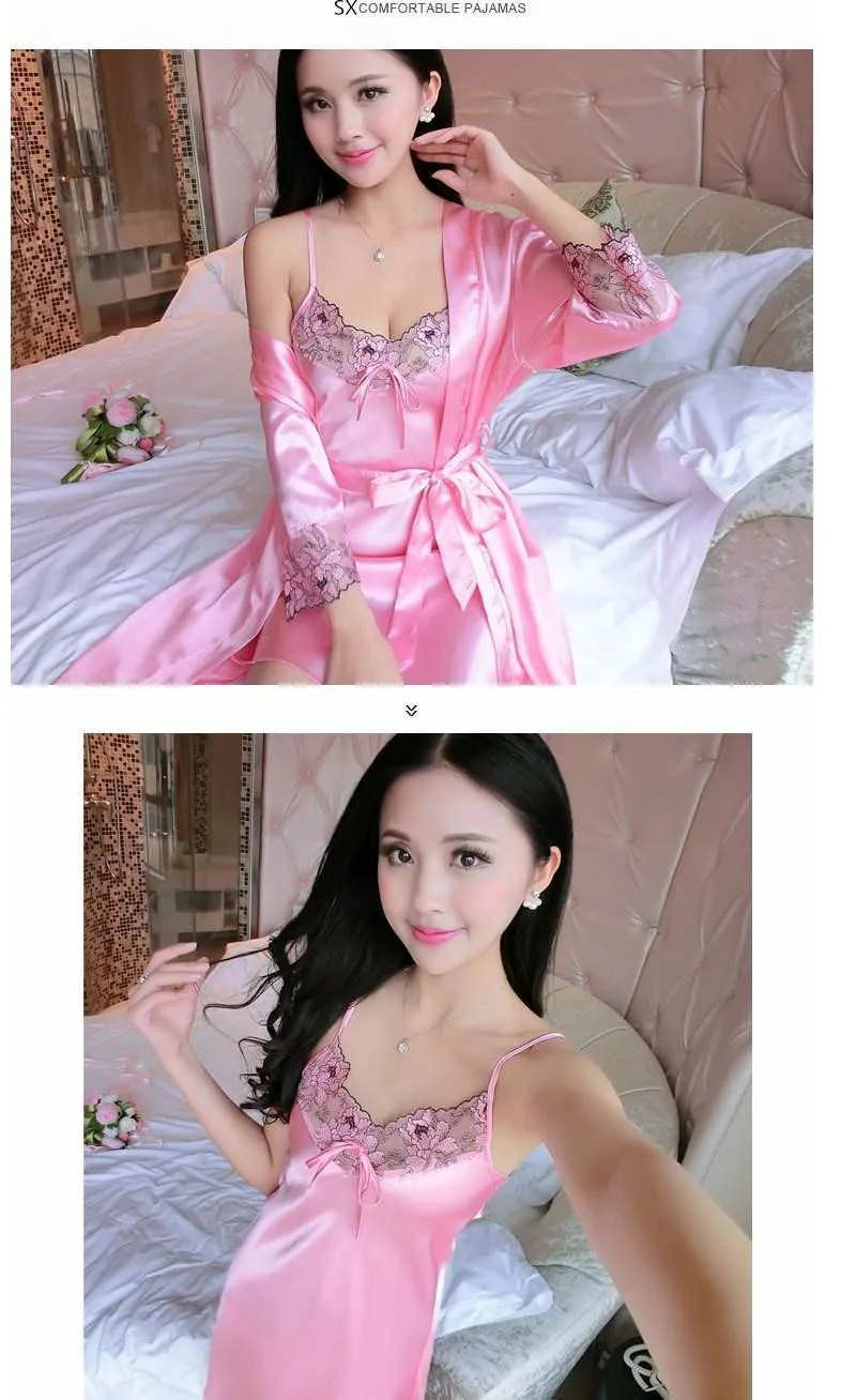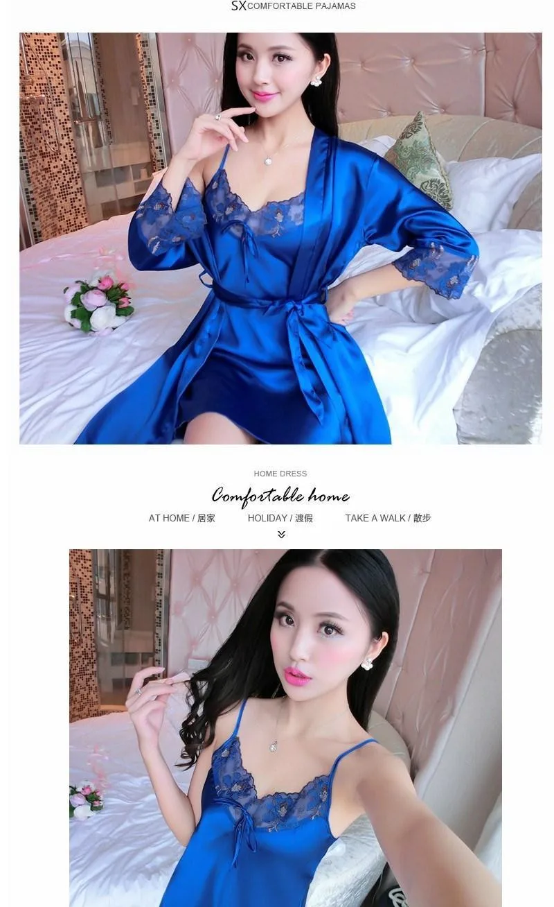 Robe Gown Sets Women Ice-silk 2PCS Floral Fashion Sexy Sleepwear Lace Up Chic Thin Womens Bathrobe Home Nightwear Comfortable