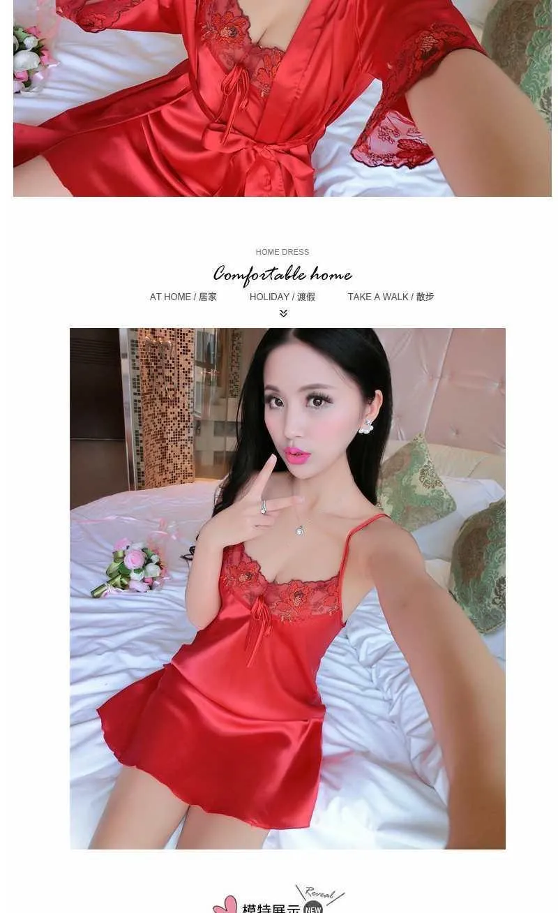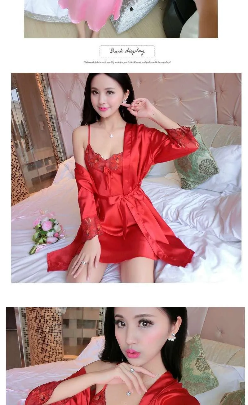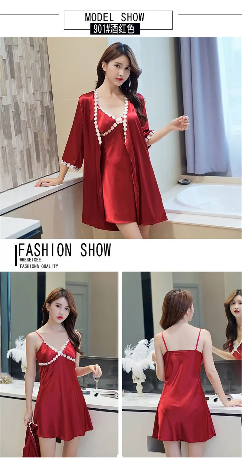 Robe Gown Sets Women Ice-silk 2PCS Floral Fashion Sexy Sleepwear Lace Up Chic Thin Womens Bathrobe Home Nightwear Comfortable